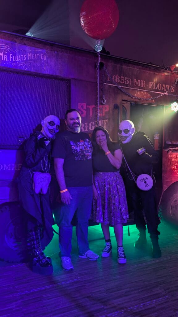 Paul and I picked up a few t-shirts from @teenoevil. We have purchased their shirts before and they have really unique designs, good quality, and they soft through multiple wears and washes. We also made our way through several mazes including Sid’s Twisted Toy box, which featured Sid from Toy Story with a menagerie of demented toys. My favorite maze was Fear Farms maze which was scarecrow themed. This maze was full of get jumpscares and had me screaming and laughing throughout. Mr. Floats had a small maze and photo opp, which included photos with the “TWINS”.