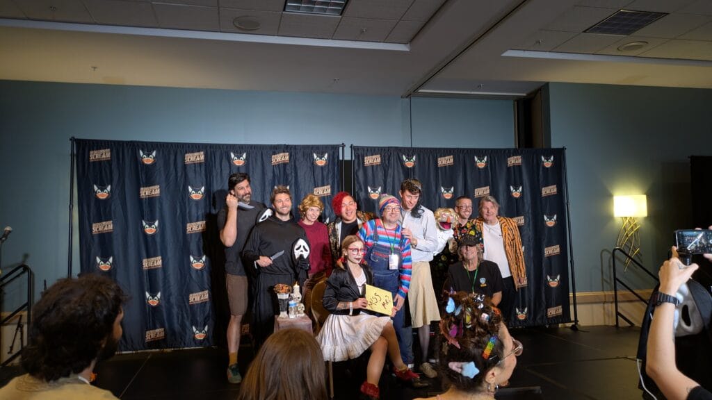 Following that show, we got to see the Horror Nerd comedic performance. Horror Nerd is hosted by comedian Samantha Hale, and travels throughout So Cal giving performances. The lineup of comedians changes frequently but the theme is always horror. For the con, Samantha played a version of The Conjuring Universe doll Annabelle. In this performance, Annabelle is now a therapist and was giving advice to horror icons such as; Norman Bates, Chucky, Jason, and Ghostface. I am a fan of their extension podcast who is hosted by Samantha, Tony, and Bonnie Marie Williams (a.k.a. The Voiceover Superhero). Just like the podcast, there were tons of laughs throughout. Check out a live show of theirs if you ever get a chance.